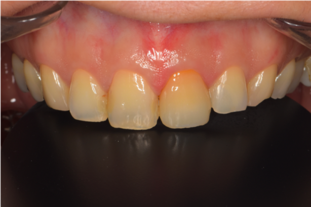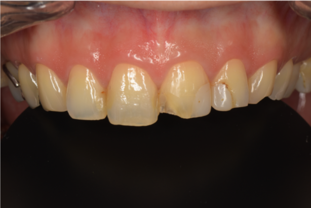 治療内容 診察の結果、左上の前歯が大きく欠けており、部分的な詰め物(コンポジットレジン等)での修復では強度や見た目の維持が難しいため、歯全体を覆う被せ物(クラウン)による治療を計画しました。