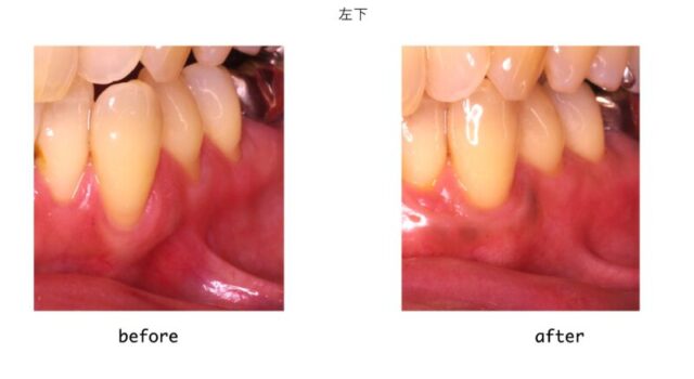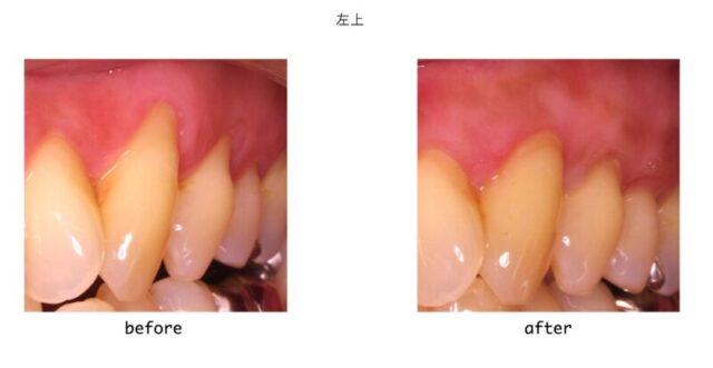 治療内容 左上、左下、右下の計3箇所に歯肉退縮(歯茎が下がって歯の根面が露出した状態)が認められました。 放置すると知覚過敏や根面う蝕(根っこの虫歯)のリスクが高まるため、ご自身の組織を移植して歯茎を再建する「結合組織移植術(CTG)」を用いた根面被覆術を行いました。 上あごから採取した結合組織を退縮部位に移植することで、露出した根面を覆い、健康的で厚みのある歯茎を回復させました。