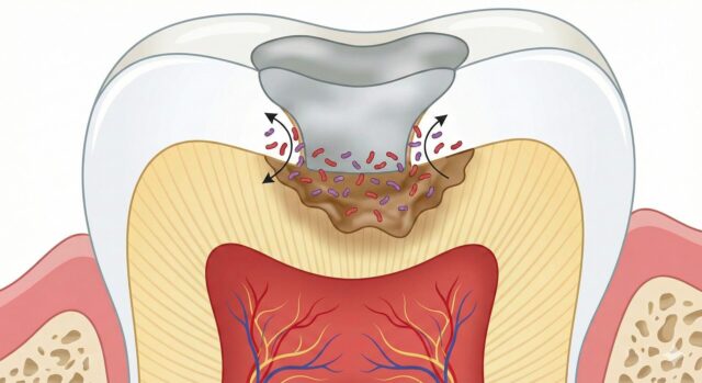 詰め物を歯に固定しているセメント自体が、唾液や口腔内の酸に触れることで少しずつ溶け出します。これにより、内部に細菌が侵入する「トンネル」が作られてしまうのです。