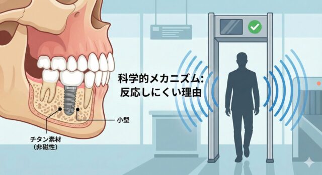 口腔内には他にも金歯や銀歯(保険診療の金属)が入っている方もいますが、これらも通常は小さすぎて反応しないレベルです。チタンは特に非磁性であるため、保安検査において最も問題を起こしにくい歯科用金属と言えます。
