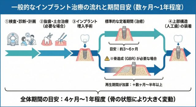 この期間が大きく変動する最大の要因は、顎の骨の状態です。骨量が不足している場合、インプラントを安全に埋入するためにGBR(骨造成)などの追加処置が必要となり、その再生期間(数ヶ月〜半年以上)が加算されます。