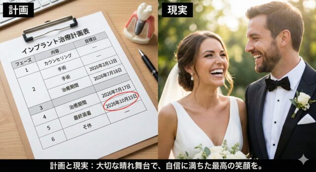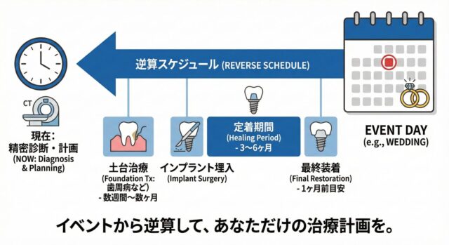 確かにインプラントは外科処置を伴うため、治癒期間が必要です。しかし、ゴールから逆算して綿密なスケジュールを組むことで、イベント当日に「見た目」と「機能」を間に合わせる方法は存在します。