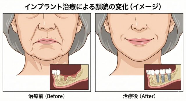インプラント治療は、単に「噛めるようになる」だけではありません。顔の構造を内側から立て直す、医学的なアンチエイジング効果が期待できます。