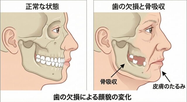 歯を失い、歯根からの刺激がなくなると、顎の骨(歯槽骨)は年間約0.25mm〜数mmのペースで痩せていく(骨吸収)と言われています。 土台である骨が痩せることで、その上にある頬や口元の皮膚・筋肉を支えきれなくなり、重力に負けて「たるみ」が発生します。