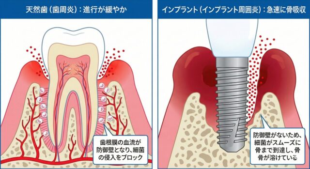 インプラントの長期維持を阻む最大の敵が**「インプラント周囲炎」**です。実は、この病気の進行スピードにも、歯根膜の有無が大きく関わっています。