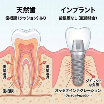 センサー機能がないため、インプラントは「どれくらいの力で噛んでいるか」というフィードバックが得にくくなります。無意識のうちに天然歯よりも強く噛んでしまい、セラミックの破損やネジの緩み、骨の吸収を招くリスクが高まります。