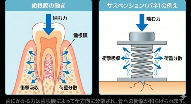 歯根膜は自動車のサスペンションのような役割を果たし、強力な噛む力を分散させて骨を守っています。