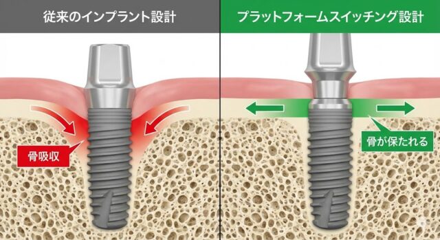 この問題を根本から解決するために開発されたのが、最新のインプラント設計概念である**「プラットフォームスイッチング」**です。