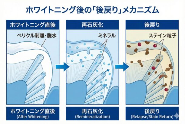 まず理解していただきたいのは、**「色戻り(リバウンド)は、ホワイトニングの失敗ではない」**ということです。歯が生きている組織であり、私たちが食事をする以上、避けられない現象です。