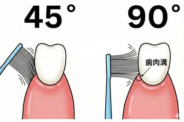 Q2. 電動歯ブラシを使っている場合も「45度」を意識すべきですか? A. はい、電動歯ブラシであっても毛先を歯肉溝に向ける「45度」が基本です。電動歯ブラシは振動効率が高いため、強く押し当てすぎないよう注意してください。