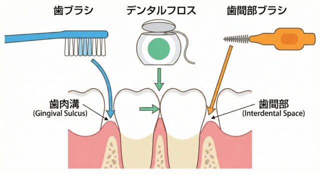 - 歯間ブラシ: 歯と歯の間や、歯肉退縮により根元にできた隙間(歯間乳頭部)を確実に清掃します。(参考:歯ブラシだけじゃ不十分!デンタルフロス・歯間ブラシで口腔ケアを格上げ)