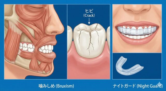 睡眠中の歯ぎしりや食いしばりは自分でコントロールできません。カスタムメイドのナイトガード(マウスピース)を装着することで、歯への直接的な負荷を緩和し、歯の摩耗や破折から守ります。これは特に、審美的なセラミック治療を受けた方や、インプラントを長持ちさせたい方にとって必須の予防策です。