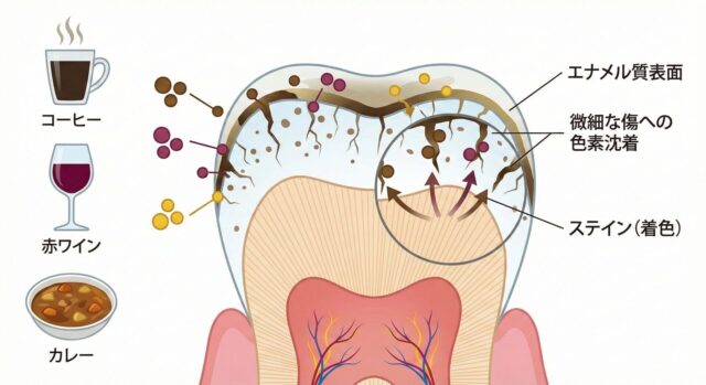 歯の着色は、エナメル質の表面にある「ペリクル(獲得被膜)」に、食品に含まれる色素(ポリフェノールやタンニンなど)が吸着することで始まります。 特に注意が必要なのは、**「歯の表面が酸で荒れているとき」**です。脱灰(だっかい)によって表面が粗造になると、色素がミクロの傷に入り込み、頑固な汚れとして定着しやすくなります。