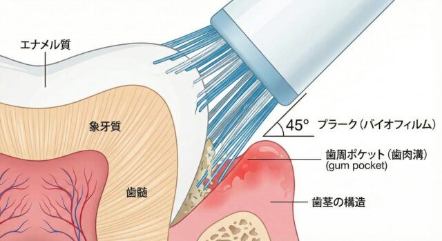 - 45度の場合: 毛先が自然と歯周ポケットの浅い部分(歯肉縁下)に侵入し、直接プラークにアプローチできます。