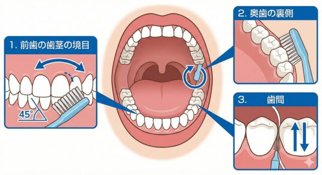 バス法の基本を理解したら、特に磨き残しが多い「3つのゾーン」を意識してみましょう。