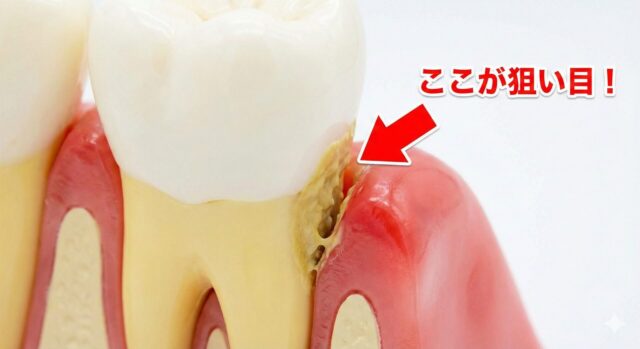 - ターゲットは「隠れたプラーク」: 歯周病の原因菌(バイオフィルム)は、歯の表面ではなく「歯と歯茎の境目(歯周ポケット)」に潜んでいます。