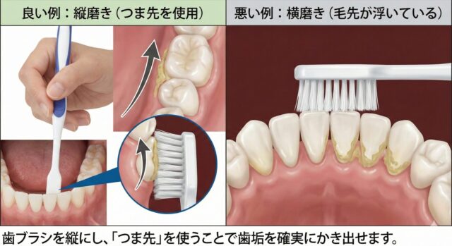 ●裏側攻略法: 歯ブラシを縦に使う「ヒール&トゥ」テクニックが有効です。