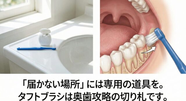 通常の歯ブラシ一本だけでこれらの「難関エリア」を100%完璧に磨くことは、歯科医師であっても困難です。構造的な隙間を埋めるために、以下の補助用具の併用が必須となります。