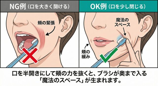口を大きく開けると、頬の筋肉(頬筋)が緊張し、歯と頬の間のスペースが潰れてしまいます。これにより、ブラシを入れる隙間がなくなってしまいます。