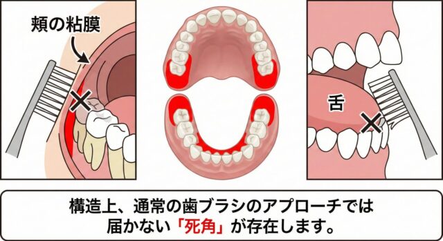 - ●なぜ磨けない?: 奥歯の奥と前歯の裏側は、骨格と筋肉の構造上、普通の磨き方ではブラシが届きません。