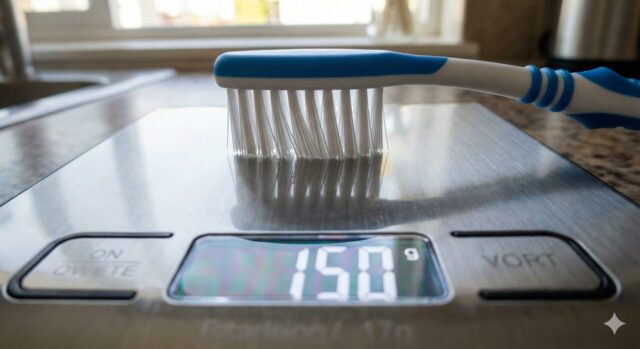 ご自宅のキッチンスケールに歯ブラシを押し当ててみてください。「毛先が広がらず、軽くしなる程度」が適正圧です。もし、磨いている最中に毛先が大きく広がっているなら、それは力が強すぎます(300g以上かかっていることが多いです)。