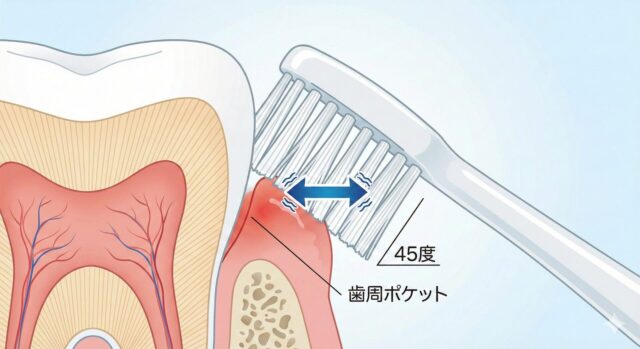 適正な圧力で、炎症の原因(プラーク)を狙い撃ちにするテクニックが**「バス法」**です。