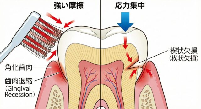 | ① 角化歯肉の摩耗と退縮 | 強い摩擦 | 過度なブラッシング圧や硬い毛先による横磨きで、歯ぐきの表面(角化歯肉)が物理的に削り取られ、歯ぐきが下がります。 |