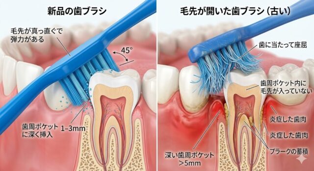 毛が外側へ開いた歯ブラシは、ポケットの入り口に当てた瞬間、奥へ進むための反発力を失っています。これを**「座屈」**と呼びます。毛先が逃げてしまい、バイオフィルム(細菌の膜)に届かないため、ただ表面を摩擦しているだけの状態になります。