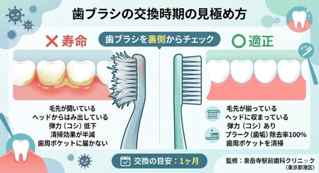 歯ブラシを裏から見て、毛先がヘッドからはみ出していたら交換のサインです。