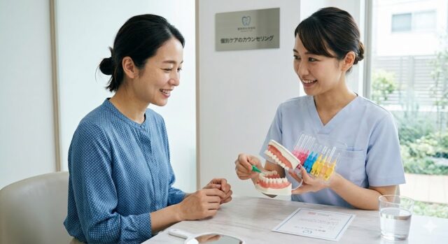 Q3: どれくらいの頻度でサイズをチェックし直すべきですか? A3: 半年に一度の定期検診時に、歯科衛生士による再評価を受けるのが理想的です。特に「食べ物が詰まりやすくなった」と感じる場合は、サイズ変更が必要なサインかもしれません。当院では患者様一人ひとりに合わせた「オーダーメイドの治療計画」に基づき、セルフケアの指導を行っています。