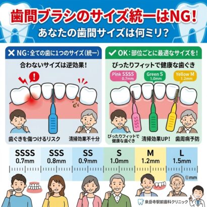 無理に合わないサイズを使用すると、清掃効果が不十分で磨き残しが生じるだけでなく、歯ぐきを傷つけたり、将来的な「歯ぐき下がり(歯肉退縮)」を招くリスクがあります。これまで500本以上のコラムを通じてお口の健康情報を発信してきた泉岳寺駅前歯科クリニックでは、膨大な臨床知見に基づき、患者様一人ひとりの口腔環境に合わせた「精密なサイズ選定」と部位ごとの使い分けを提唱しています。