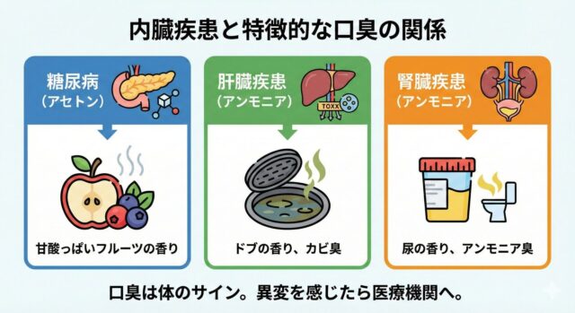 内臓疾患由来の口臭は、特定の代謝物が呼気に混じることで発生するため、それぞれ特徴的な匂いを持ちます。口臭でわかる体の異変?糖尿病、肝臓病…全身疾患が口臭に与える影響