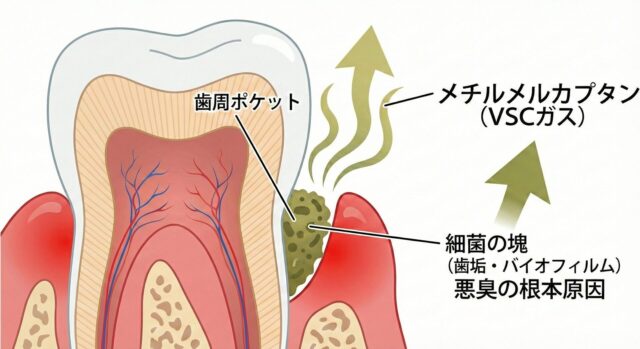 歯周病は、自覚症状が少ないまま進行します。70代の方の場合、既に長期間にわたり病気が進行していることが多く、歯周ポケットが深くなると、そこに溜まった細菌(特に嫌気性菌)が**揮発性硫黄化合物(VSC)**という悪臭ガスを大量に発生させます。歯周病の二大悪党、歯垢と歯石を徹底解説!今日からできる予防法で健康な歯茎を