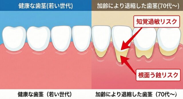加齢で歯茎が下がると、虫歯になりやすいデリケートな「根元」が露出してしまいます。