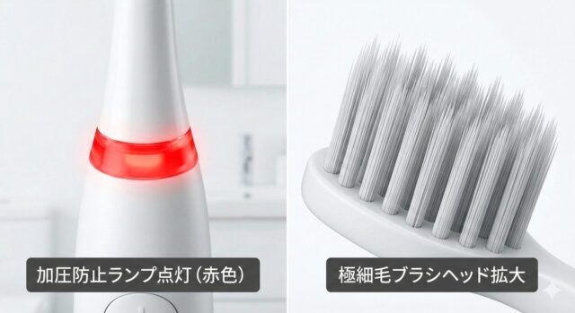 - 加圧防止センサー(必須) 感覚が鈍くなると、無意識に強く押し当ててしまいがちです。ブラシ圧が強すぎるときにランプや振動で教えてくれる機能は、歯を守るために必須です。