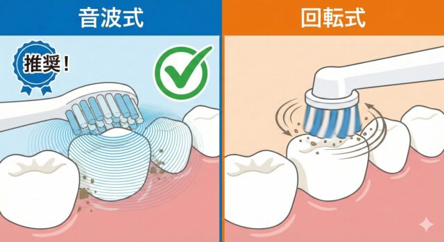 現在主流の電動歯ブラシは、「音波式」と「回転式」の2種類に大別されます。70代の口腔環境との相性を比較しました。