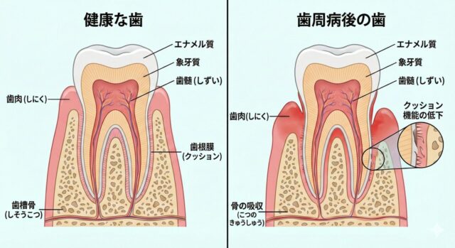 歯周病で歯を支える骨(歯槽骨)が減ると、クッション機能が低下し、硬いものを噛んだ時に痛みや違和感が生じやすくなります。