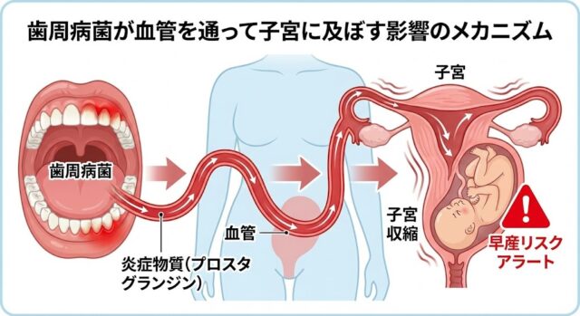 歯周病が悪化すると、お口の中で「サイトカイン」や「プロスタグランジン」といった炎症物質が作られます。これらが歯ぐきの血管から血液に入り込み、全身を巡って子宮へ到達します。