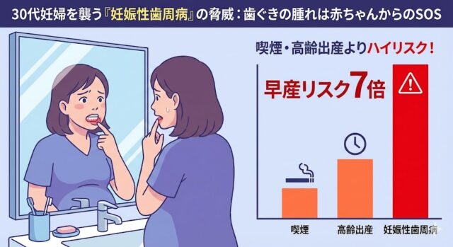 特に、仕事や家事に追われ、ご自身のケアが後回しになりがちな30代の妊婦さんにとって、この「妊娠性歯周病」はお腹の赤ちゃんに及ぶ深刻な脅威となり得ます。