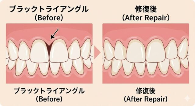 歯茎が引き締まると生じやすい「ブラックトライアングル」。審美的な修復治療で改善が可能です。