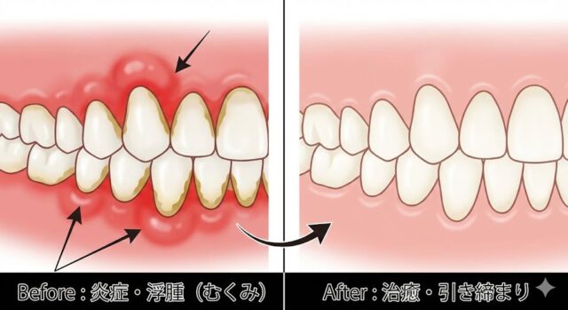 - 組織の引き締まり: ブヨブヨだった歯茎が、コラーゲン繊維の密な「硬く引き締まったピンク色の歯茎」へと生まれ変わります。