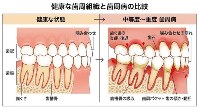 歯周病が進行すると、歯を支える骨(歯槽骨)が破壊され、歯がグラつき始めます(動揺)。