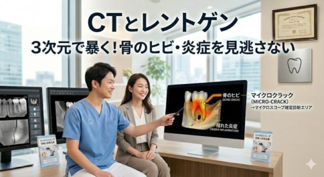 Q2. マイクロクラックがCTで見えないなら、どうやって診断するのですか? A2. CTで「炎症や骨欠損の形」を確認し、ヒビの可能性を絞り込んだ上で、最終的にはマイクロスコープで歯の内部を20倍以上に拡大して直接目で確認します。CT(診断のヒント)とマイクロスコープ(確定診断)を掛け合わせることで、大切な歯を残せるかどうかの判断を正確に行います。